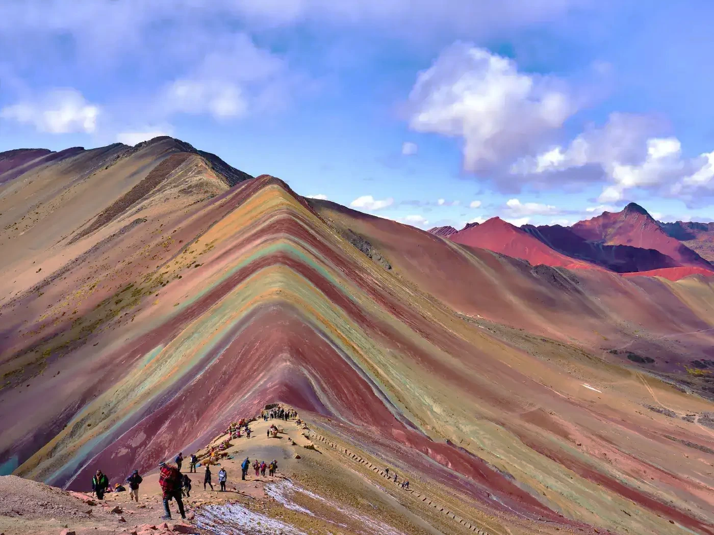 We’ll begin our two-hour ascent toward the spectacular viewpoint of Rainbow Mountain (5,100 m / 16,732 ft). As the sun illuminates the vibrant mineral bands across Vinicunca’s slopes, you’ll be rewarded with jaw-dropping panoramic views. From this vantage point, the surrounding peaks—including the mighty Ausangate—tower dramatically against the deep blue sky. The vistas here offer some of the most Instagram-worthy views in Peru.